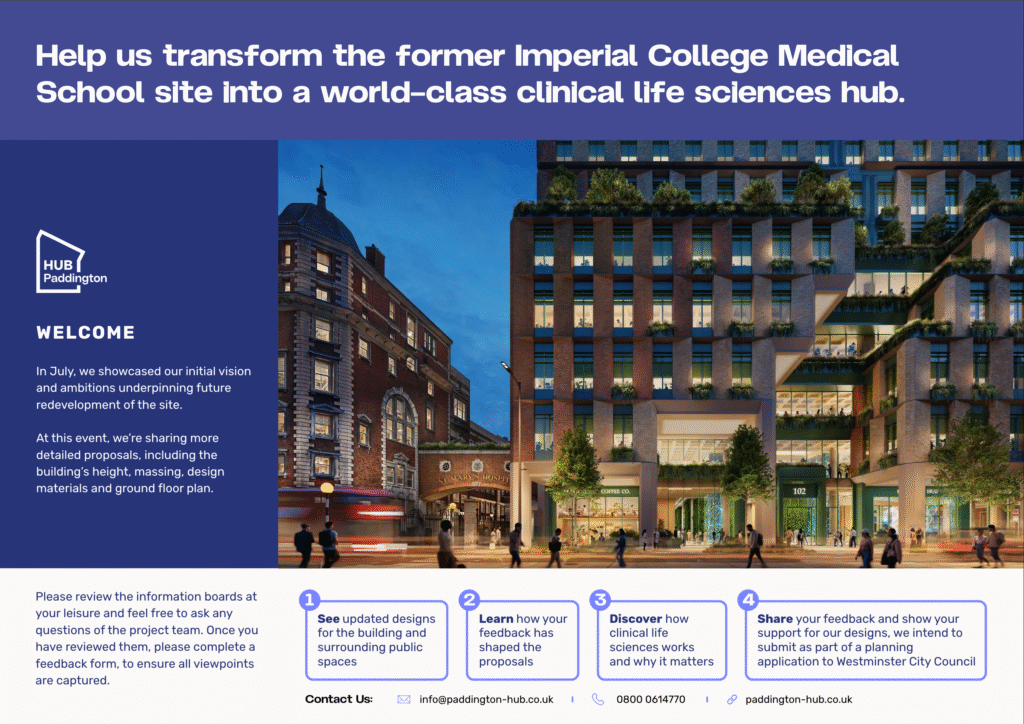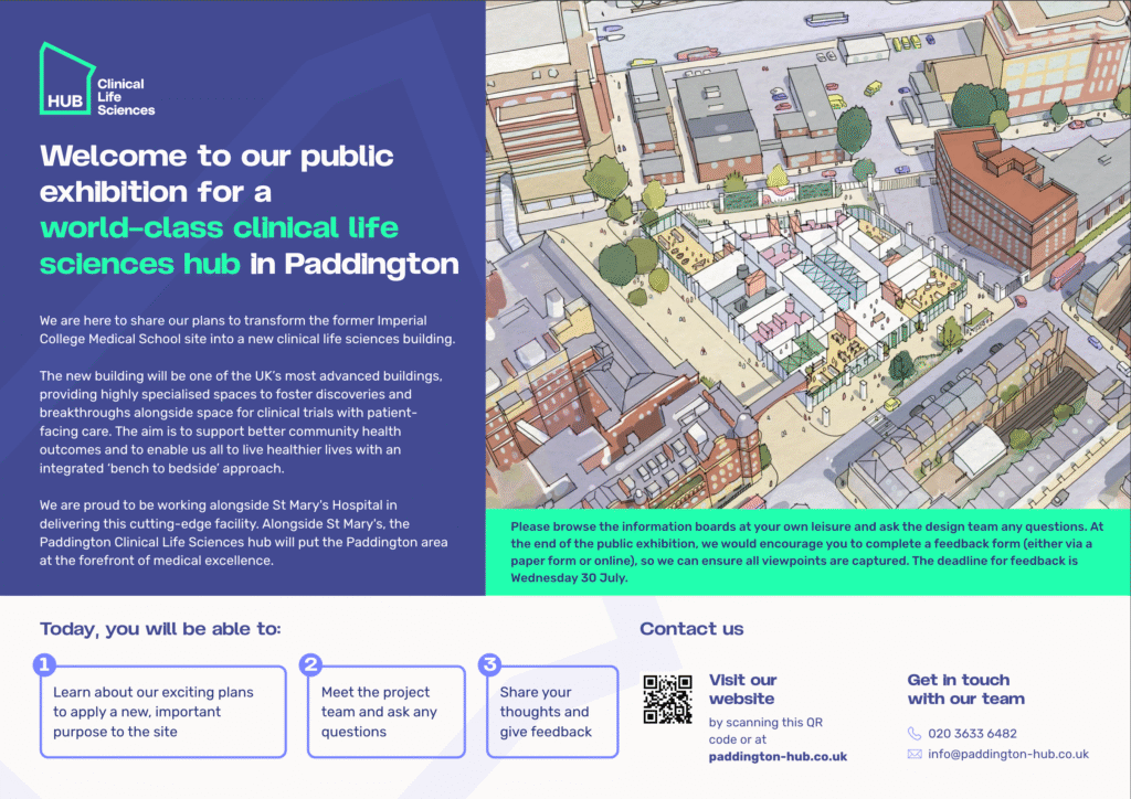 Take a look at the exhibition boards displayed at our public consultations and learn more about our proposals for the Clinical Life Sciences Hub in Paddington.